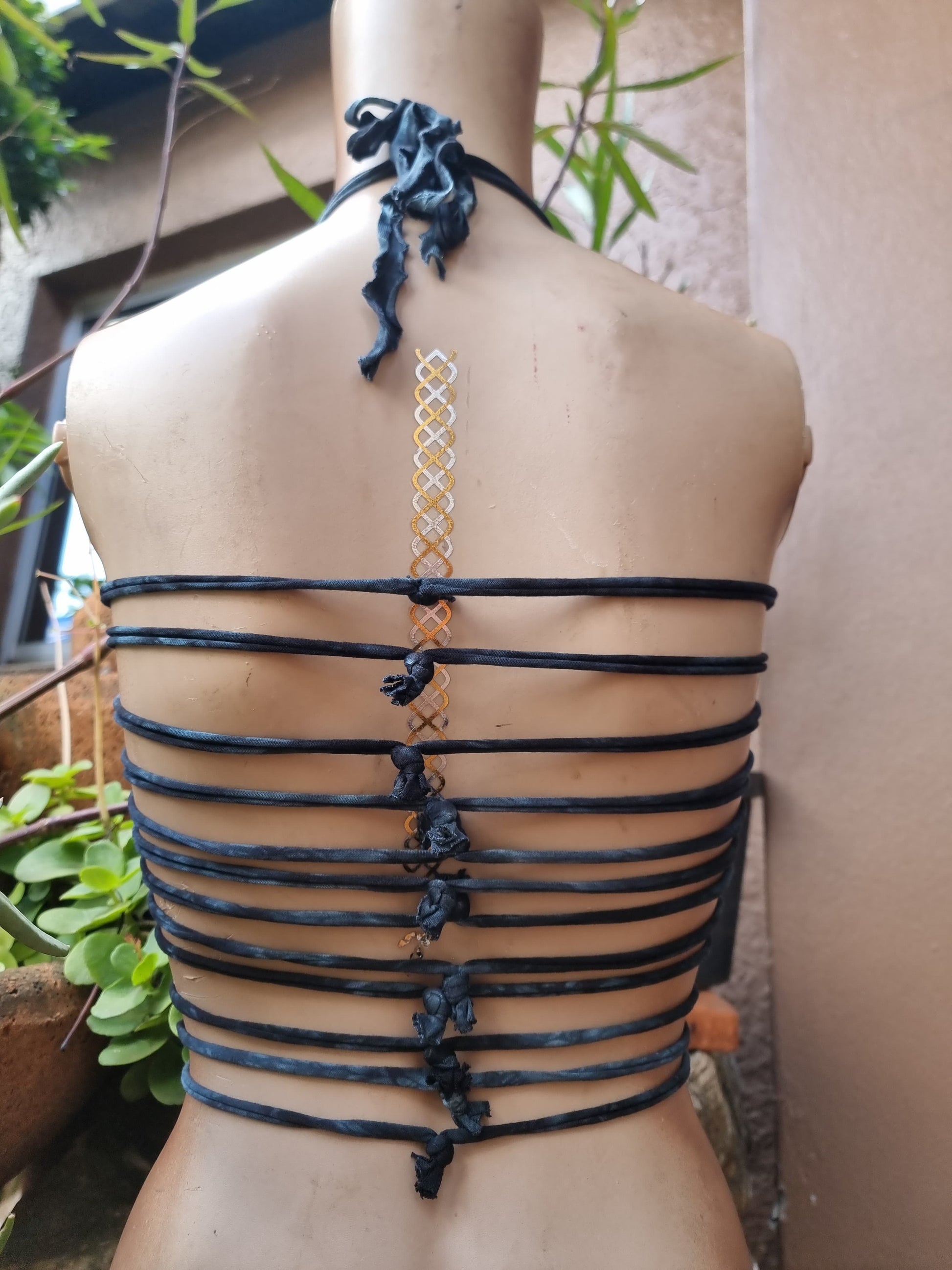 Handcrafted in India from soft cotton, it features a striking front ladder-style cutout and fully adjustable knotted straps along the back, giving you a customizable fit from small to medium.