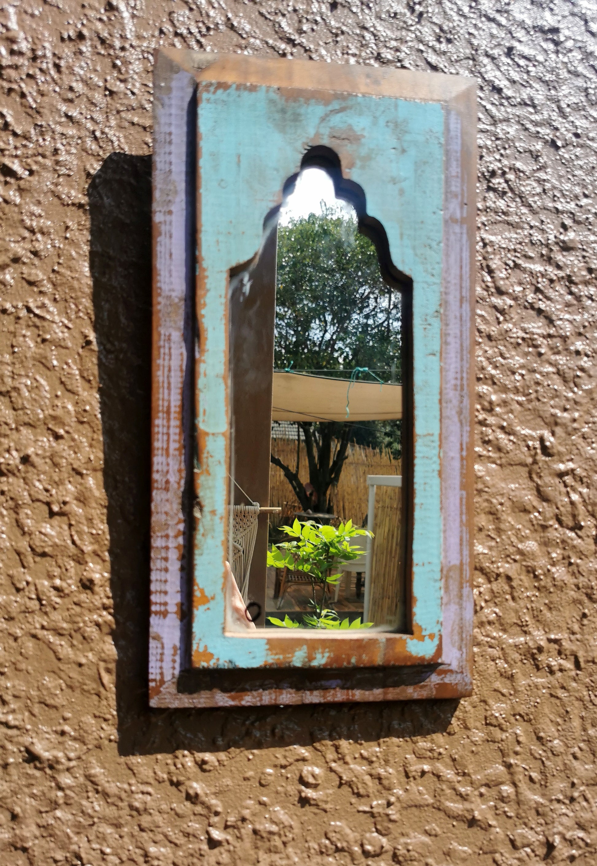 This beautifully crafted distressed wood mirror from India adds a touch of rustic charm to any room. The unique texture and finish of the wood brings natural beauty and character to your home decor. A must-have for those seeking a vintage and eclectic look.