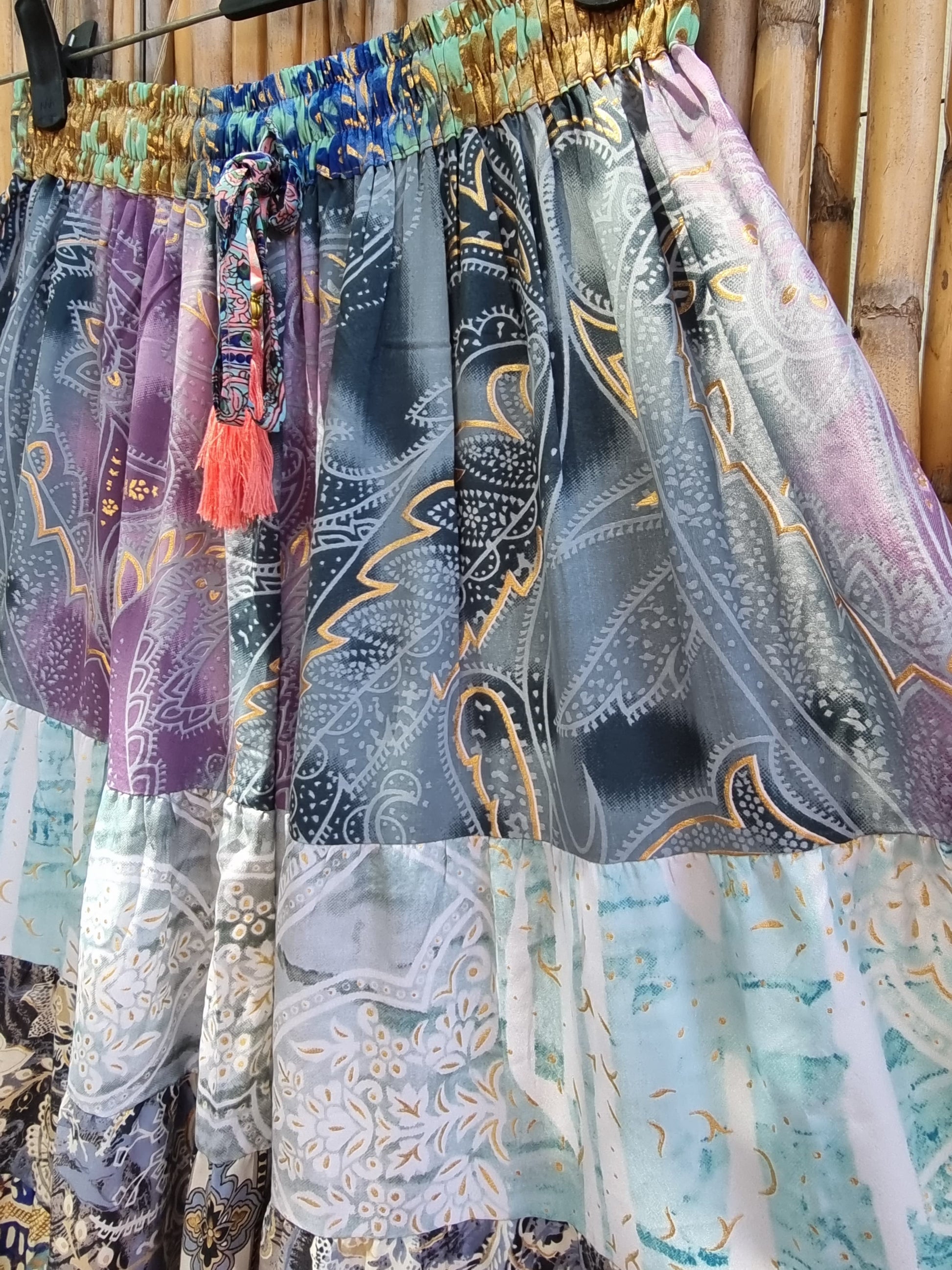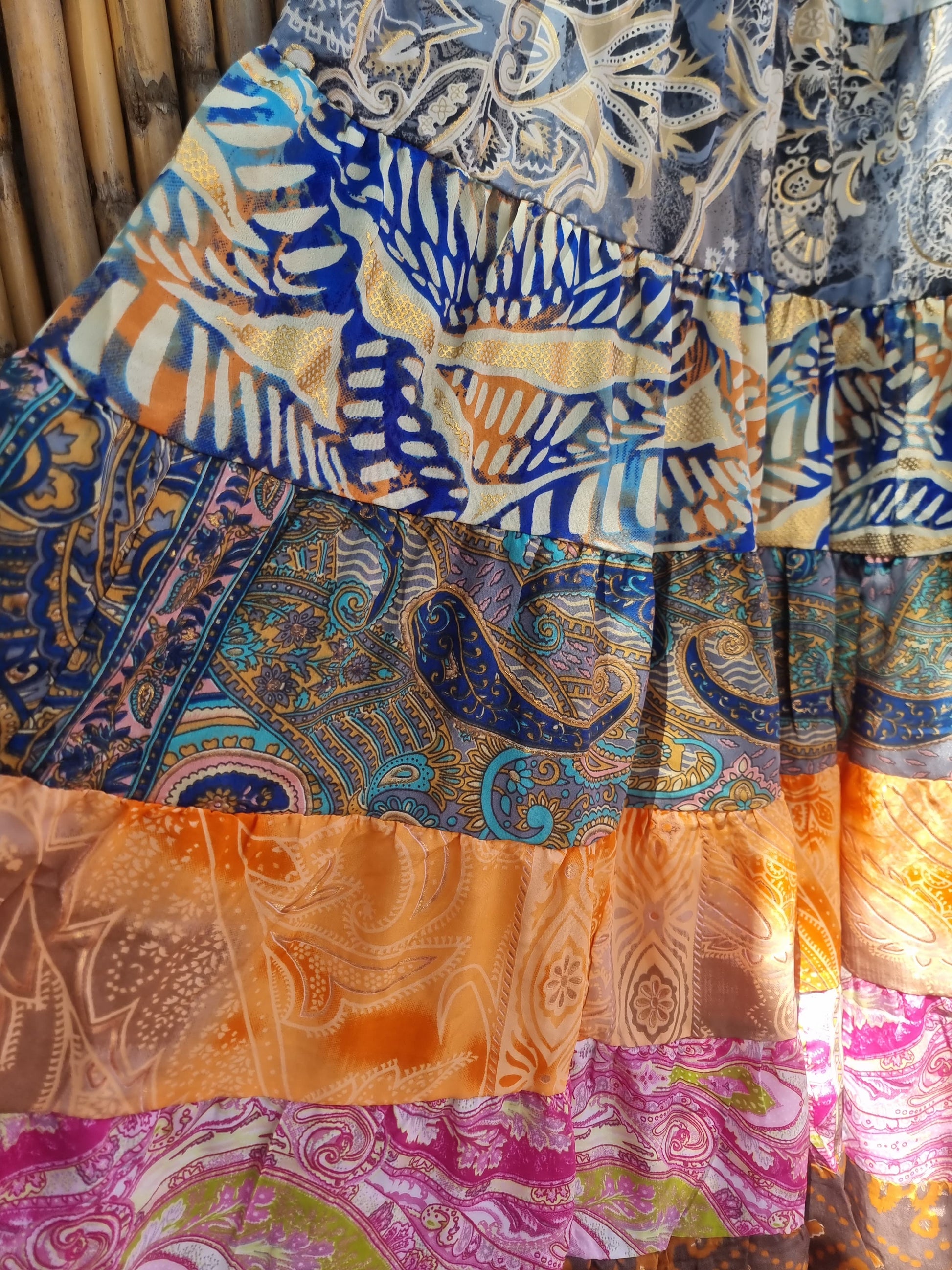 Each tier features unique prints and vibrant tones, giving it that one-of-a-kind bohemian charm. The adjustable waist with tassel ties ensures a comfortable fit from small to large — perfect for festivals, beach days, or simply expressing your inner goddess.