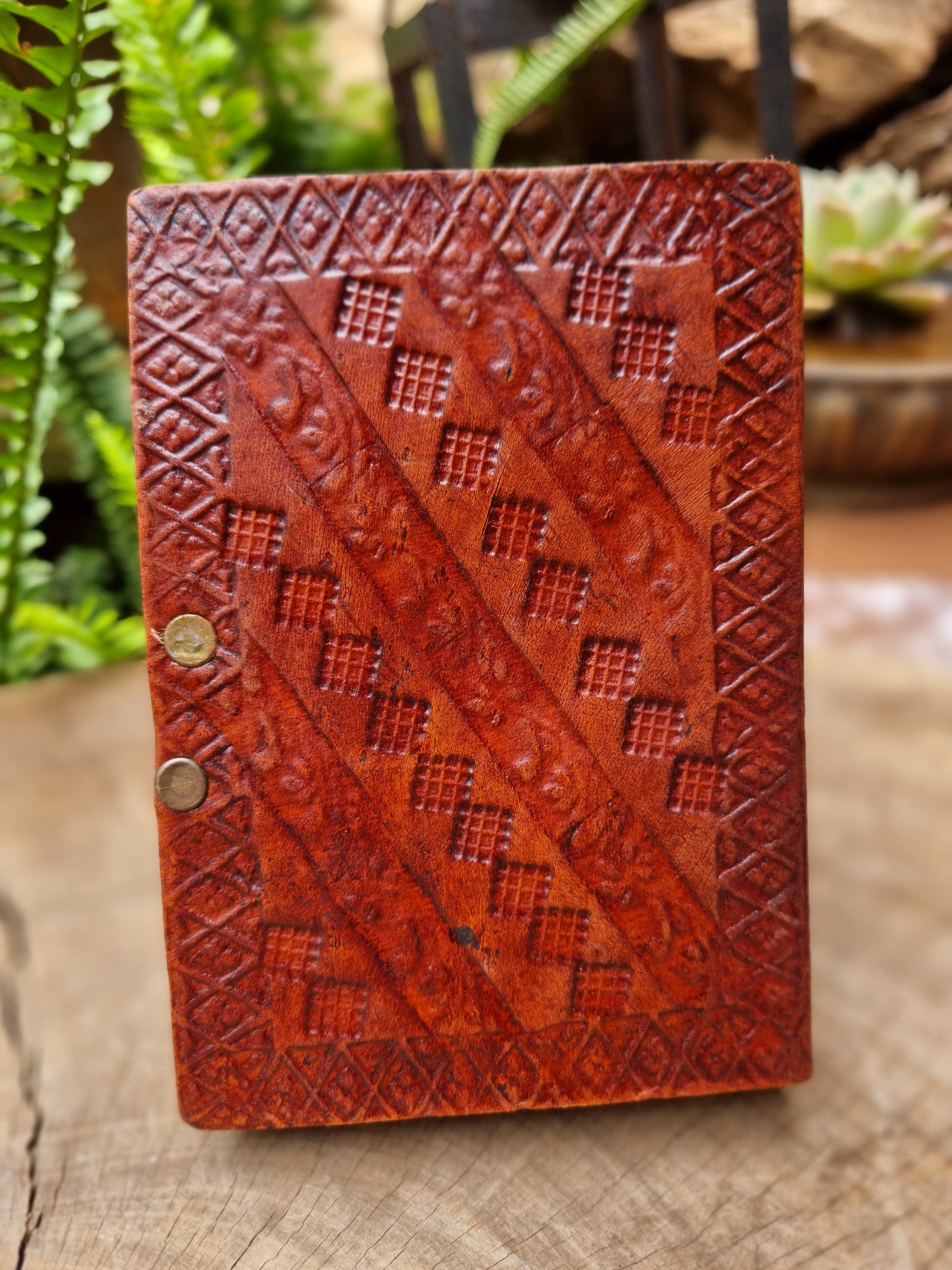 Take your writing to the next level with this leather journal from India. Crafted with care and featuring an eye-catching design, it's the perfect blend of style and function. Let your words flow freely in this unique and playful journal.
