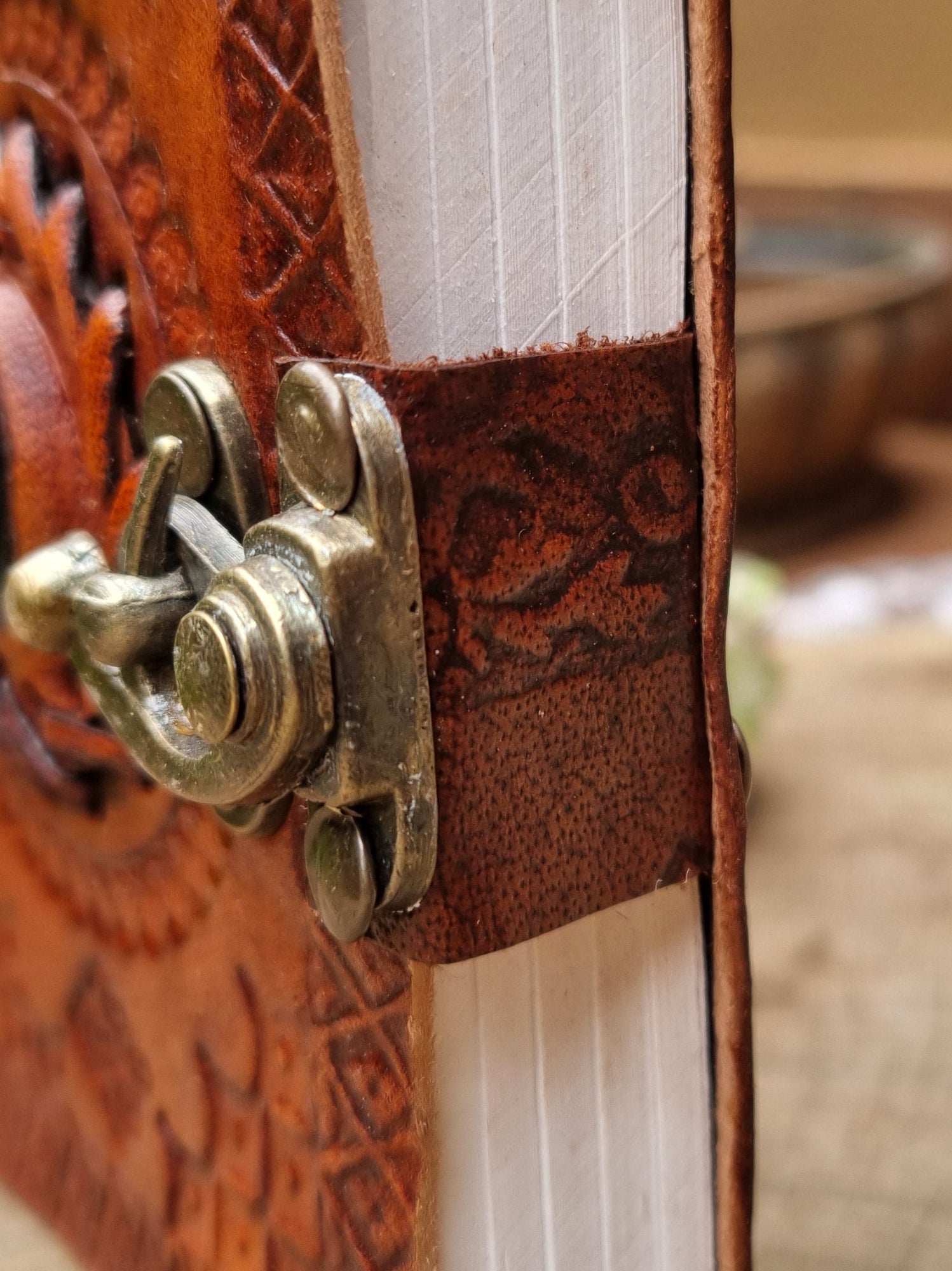 Take your writing to the next level with this leather journal from India. Crafted with care and featuring an eye-catching design, it's the perfect blend of style and function. Let your words flow freely in this unique and playful journal.