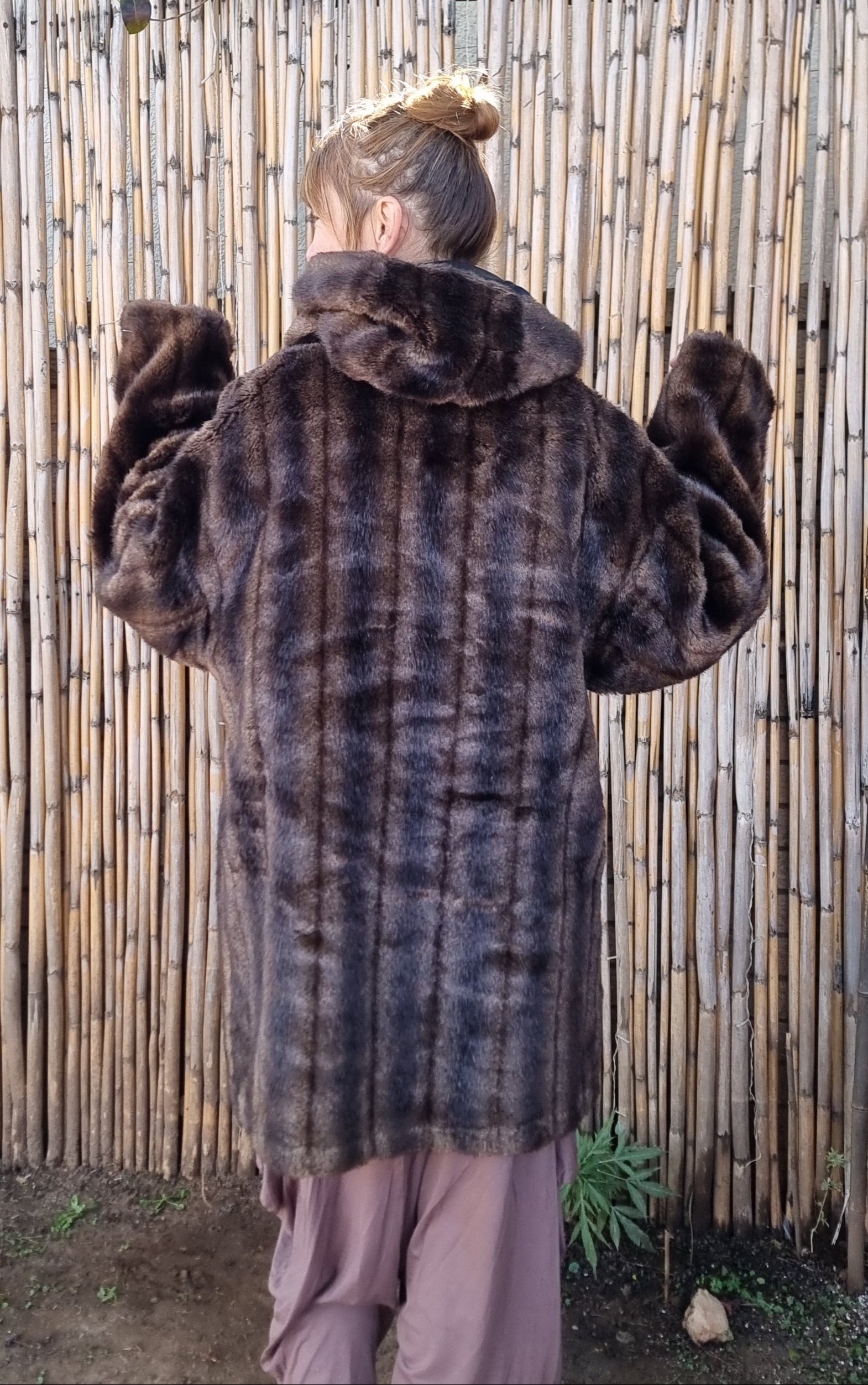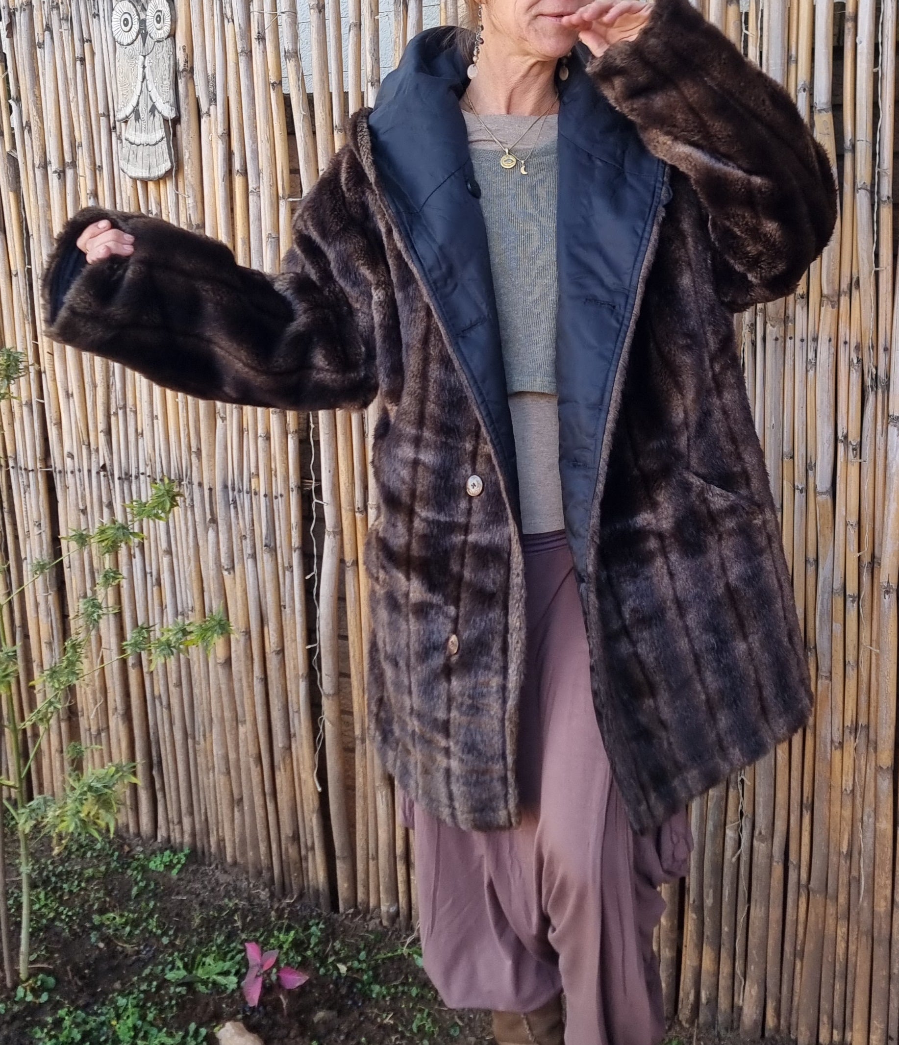 Its shin-length, deep color, and soft textures make it a standout layer for chilly days and cozy nights out