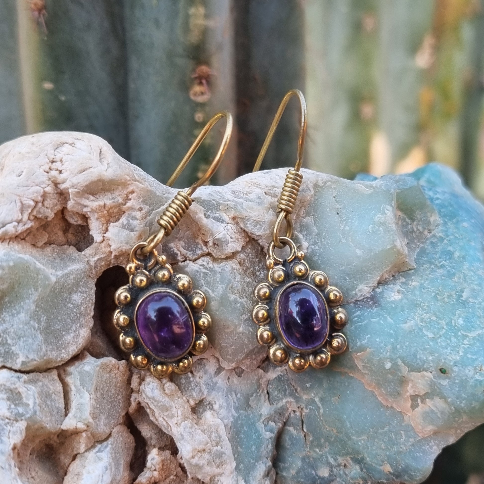 The deep purple stone is set in an ornate, brass frame with delicate beading all around. Handcrafted and full of charm, they’re perfect for adding a touch of boho glam to your everyday or evening look.