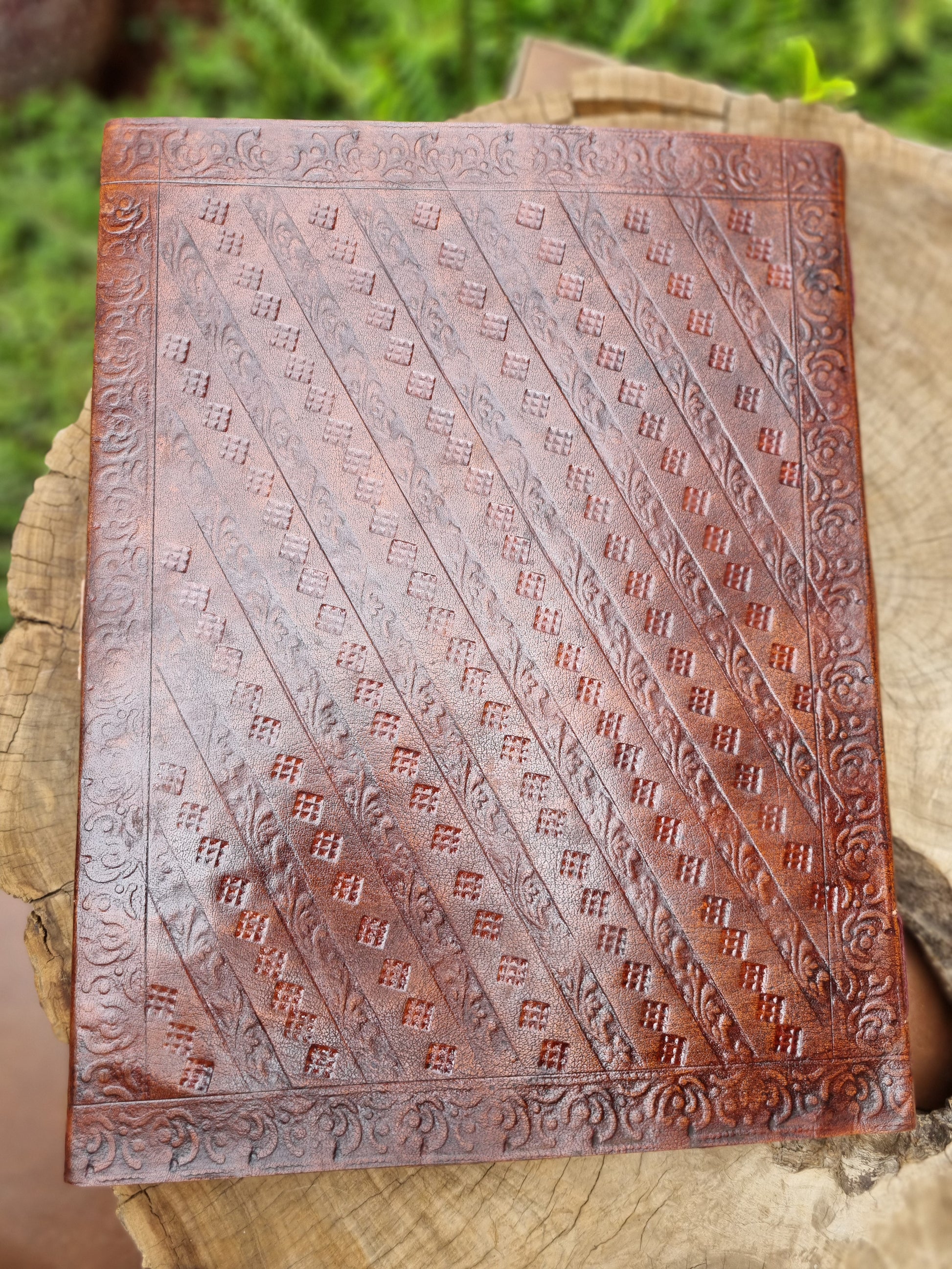 Take your writing to the next level with this leather journal from India. Crafted with care and featuring an eye-catching design, it's the perfect blend of style and function. Let your words flow freely in this unique and playful journal.